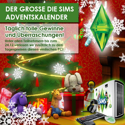 Oh Du schöne Vorweihnachtszeit! Der 1. Advent ist da! Zusammen mit dir warten wir auf Weihnachten. Damit es bis dahin garantiert nicht langweilig wird, haben wir wieder einen einmaligen Die Sims Adventskalender für dich zusammengestellt, der das Herz eines jeden Fans höher schlagen lässt. Dich erwarten viele tolle simlische Preise. Jeden Tag kannst du ein Türchen öffnen und mit etwas Glück gewinnen. Als Hauptpreis winkt ein PC im Die Sims 3 Design.