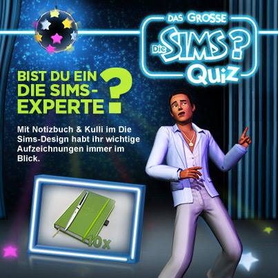 Du hast die Möglichkeit, eines von fünf äußerst praktischen Die Sims 3-Notizbüchern samt Kuli zu gewinnen zu gewinnen. Du hast ab sofort bis morgen (03. April) 20 Uhr Zeit, unter folgendem Link am Die Sims-Quiz teilzunehmen und die Gewinnfrage zu beantworten: http://bit.ly/1lZEbgt